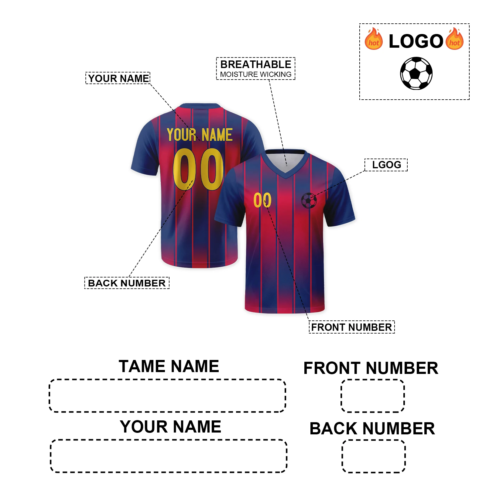 Personalized Football Shirt with Logo, Name and Number, Red and Blue Football Jersey for Men, Youth, Women and Fans
